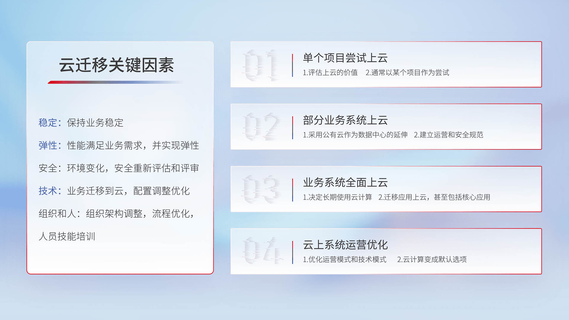 结合实际业务,,,从规划设计、、、云平台选型、、、云原生改造、、、数据迁移、、、集成交付,,,,迁移全过程为客户识别最佳上云路径,,做好风险识别管理,,,,设计网络架构、、、身份权限、、、安全审计合规、、、操作审计、、、日志审计、、、、监控告警策略、、多站点容灾设计等,,,,对云上基础设施进行整体规划,,,,提升IT治理水平,,,,以满足弹性、、、高可用、、、、高性能的需求。。。。