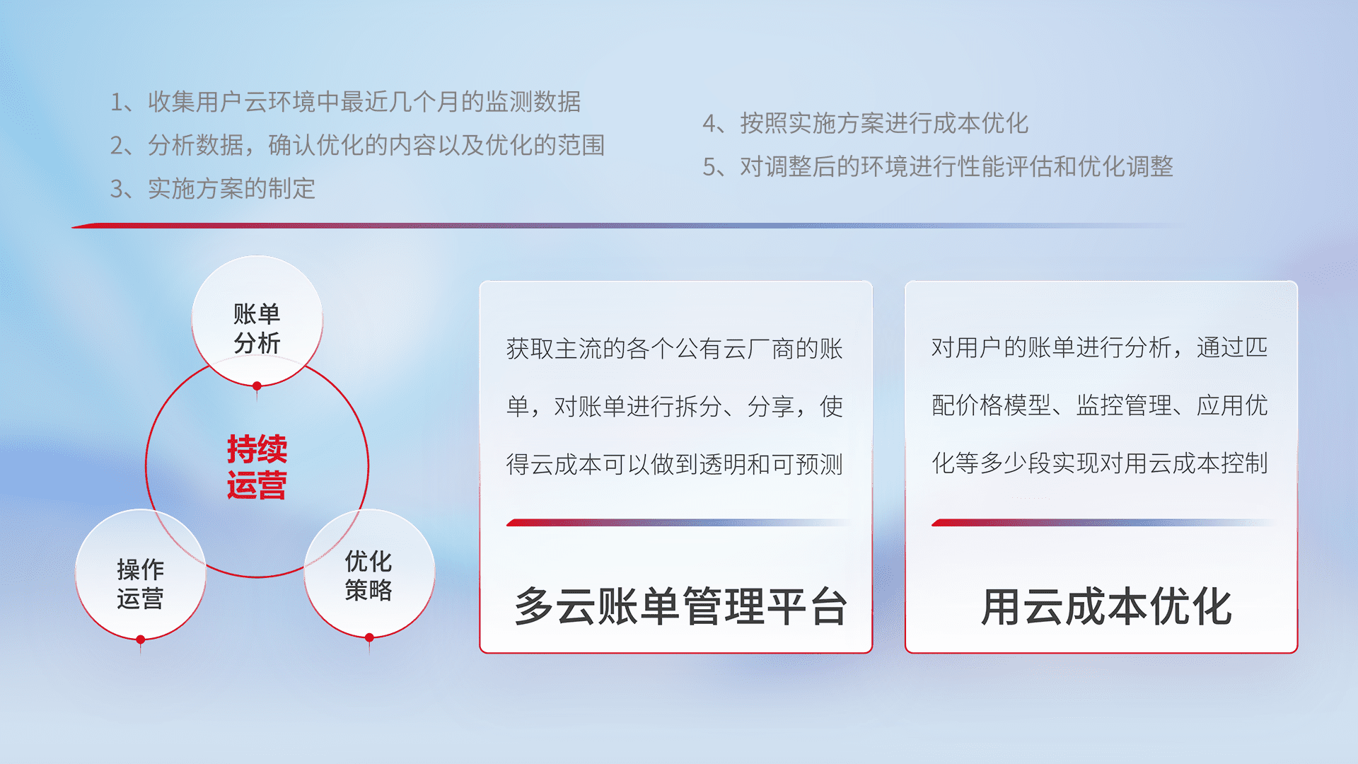 通过多云纳管,,,以统一的资源数据模型把客户的云资源进行抽象和封装,,,,进而实现对多云资源的统一操作,,,,保障云资源管理的可靠性、、、、稳定性与可用性。。量身定制化运维内容,,配置、、开发运维、、补丁管理、、、备份、、监控、、认证和访问管理、、、审计和日常巡检等,,,保障在用云过程中的可靠度,,,,稳定度以及高可用率。。。。