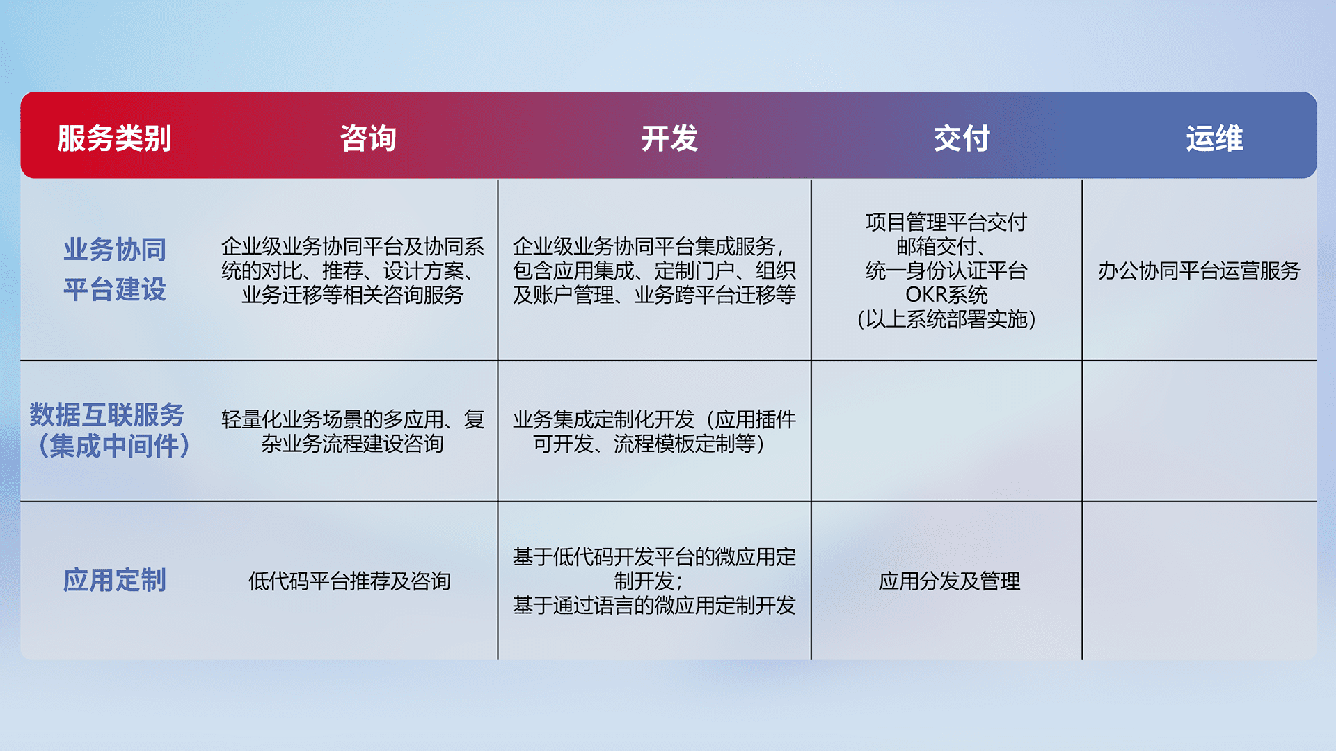 针对钉钉、、企微、、IDaas等平台级产品提供产品的规划、、、、方案、、、、交付、、、、定制化开发等服务,,,,实现如统一协同办公、、、、智能客户服务、、混合会议管理、、、智能数据查询、、、、等业务场景,,实现数字化转型。。